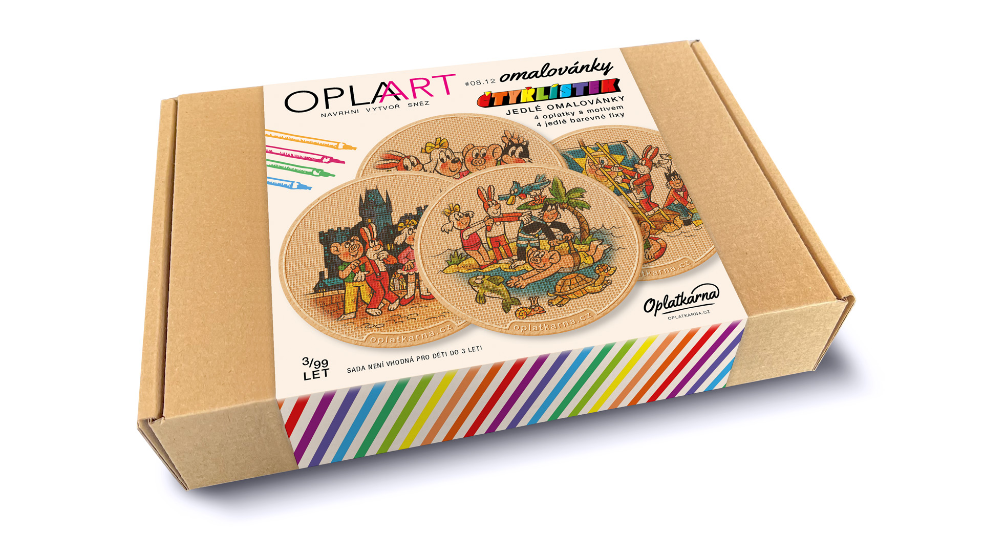 Čtyřlístek jsou čtyři nerozluční kamarádi: Fifinka, Pinďa, Myšpulín a Bobík. Zažívají spolu mnoho zajímavých příběhů. Na čtyřech oplatkách jsou černou barvou předtištěné kresby z jejich dobrodružství Tvým úkolem je obrázky vybarvit pomocí jedlých fixek.