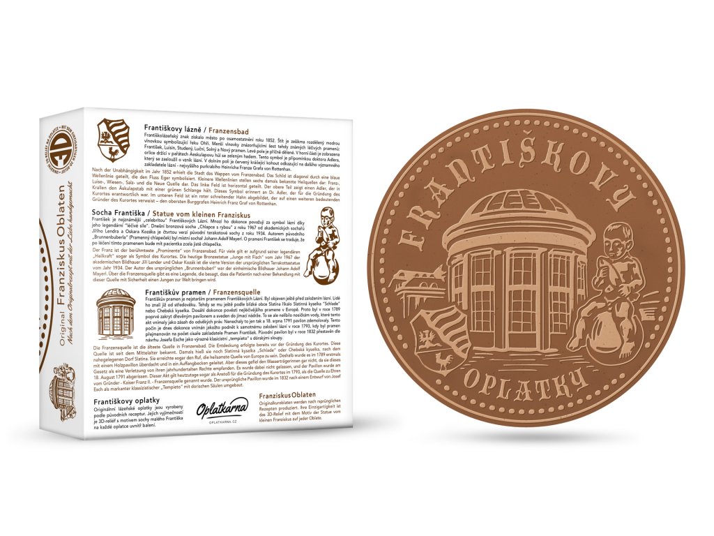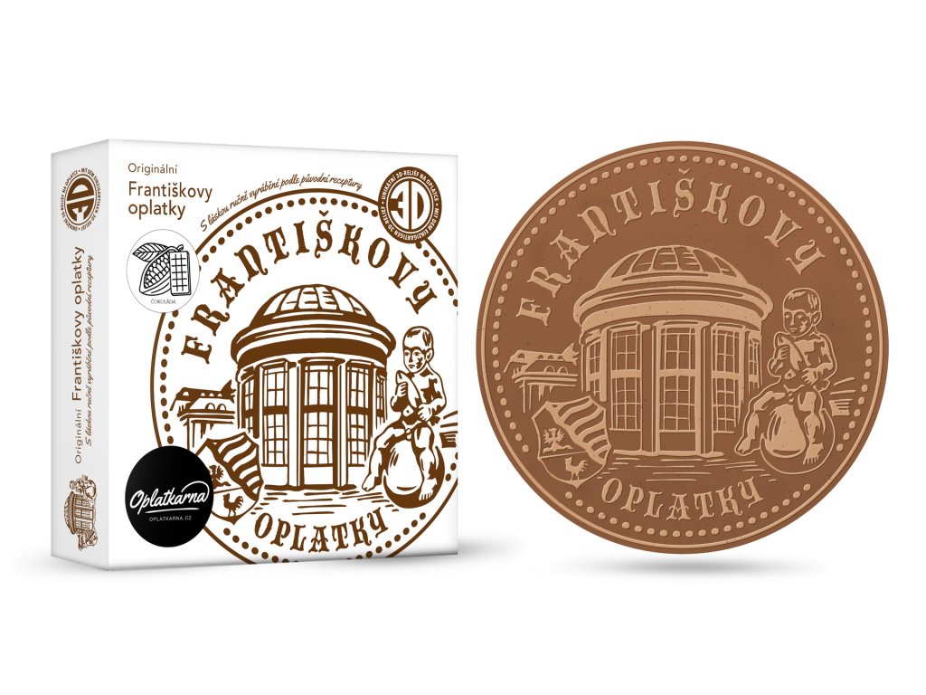Originální lázeňské oplatky vyráběně klasickou technologií. Čokoládová příchuť je nejoblíbenější u široké veřejnosti. Motiv na oplatce je tvořen reliéfem ve stejné barvě jako materiál oplatky. Každá krabička obsahuje 5 ks klasických lázeňských oplatek o průměru 18 cm (standardní velikost).