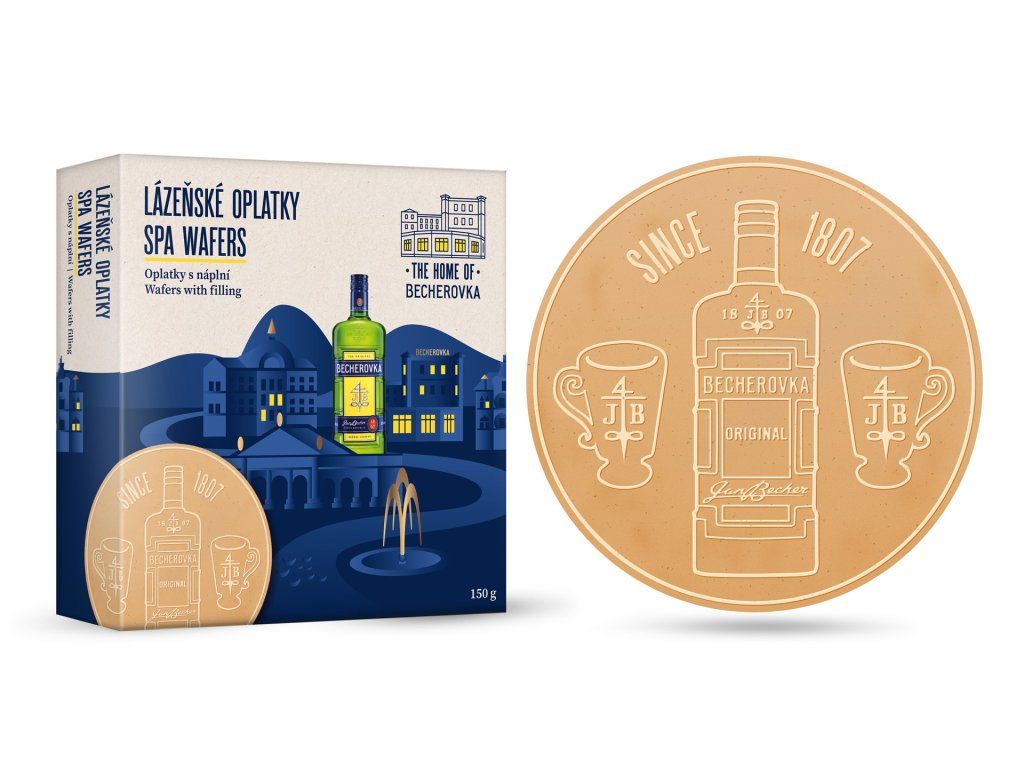 Originální lázeňské oplatky vyráběně klasickou technologií. Motiv na oplatce je tvořen reliéfem ve stejné barvě jako materiál oplatky. Každá krabička obsahuje 6 ks klasických lázeňských oplatek o průměru 18 cm (standardní velikost).