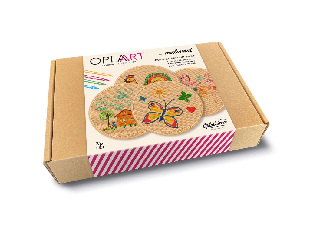 Obsah balení: 4 oplatky o průměru 120mm, 4 jedlé fixy různých barev (červená, modrá, zelená, žlutá (nebo oranžová), ), podložka pod oplatky, šablona s motivy vzorů obrázků.