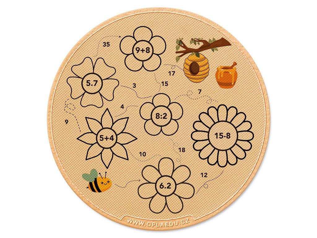 VČELKA: Doveď včelku do úlu. Vypočítej příklad v květině. Pak vyber správný výsledek a přeleť na další příklad. Až vše spočítáš, vybarvi si všechny květiny. Pak můžeš celou oplatku za odměnu sníst :-)