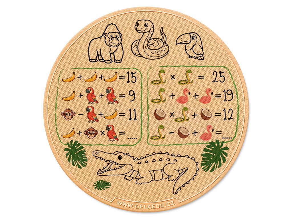 DŽUNGLE: Dokážeš odhalit, jaká čísla se skrývají pod symboly? Rozlušti všechny příklady a výsledky dopiš na obě vyznačená místa. Nezapomeň, že násobení má přednost! Nakonec obrázky vybarvi a dej si odměnu :-)