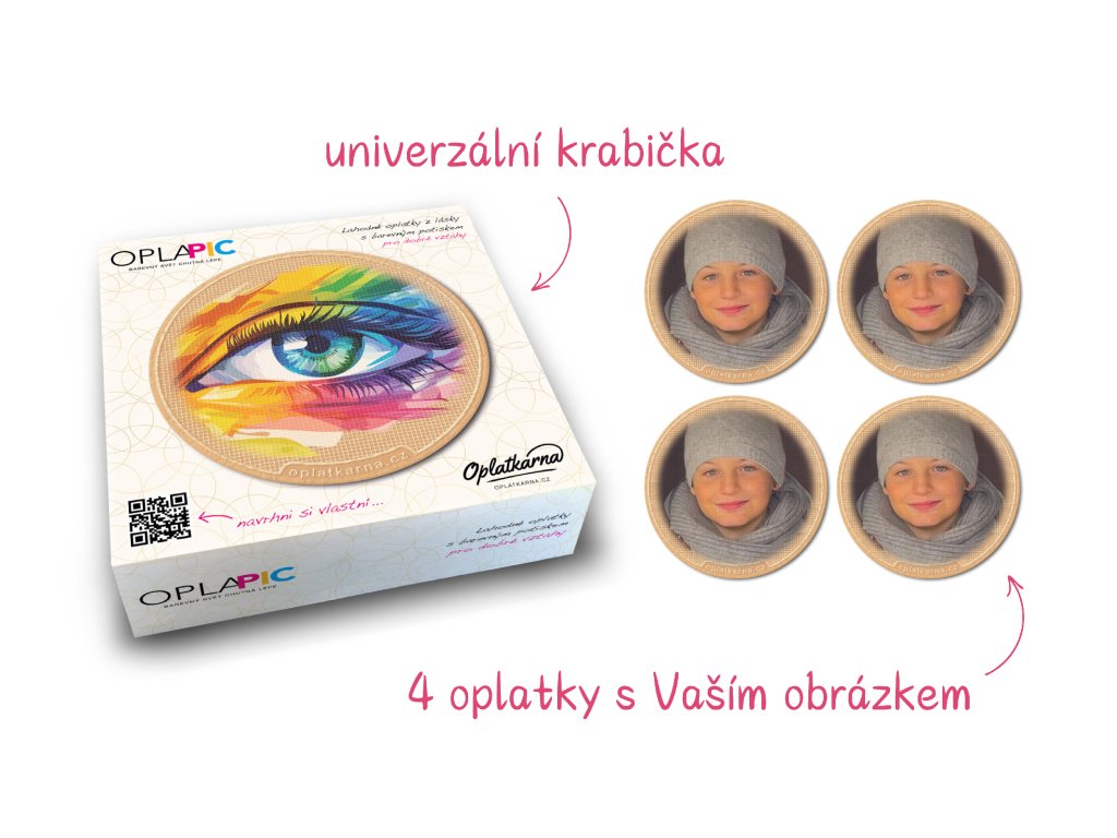 Produkt OPLAPIC STANDARD OKO obsahuje 4 vanilkové lázeňské oplatky o průměru 120 mm s jedlým potiskem na přání. V produktu OPLAPIC STANDARD je potisk jednotný pro všechny 4 oplatky.